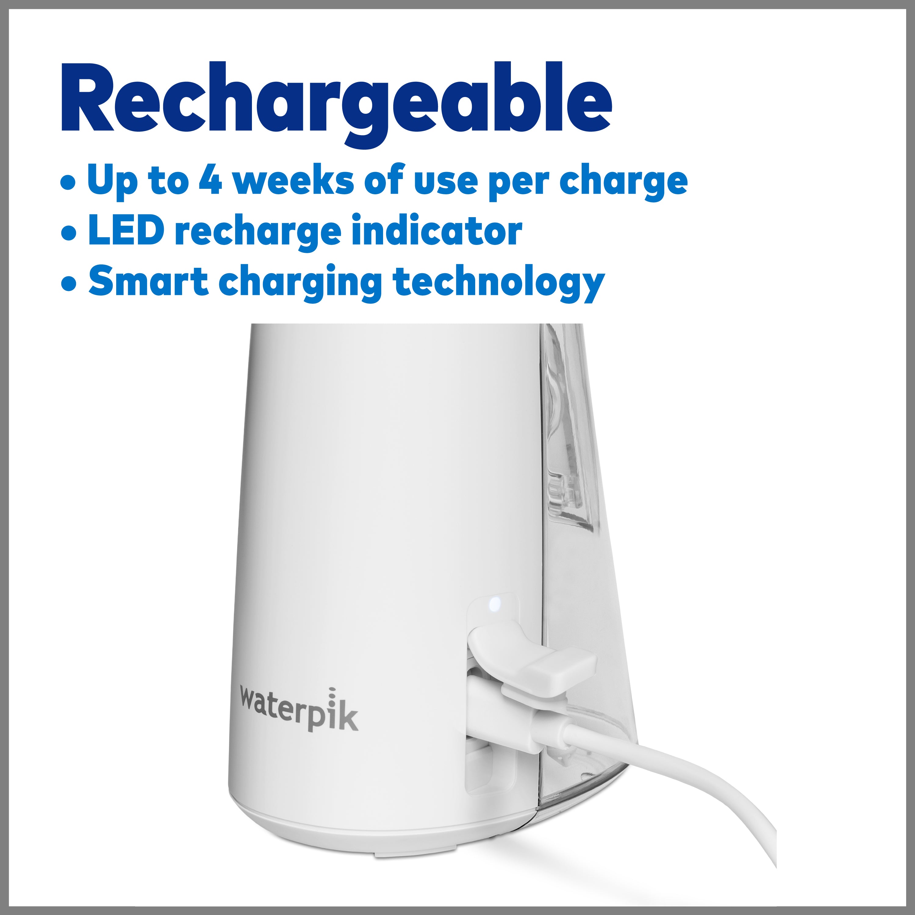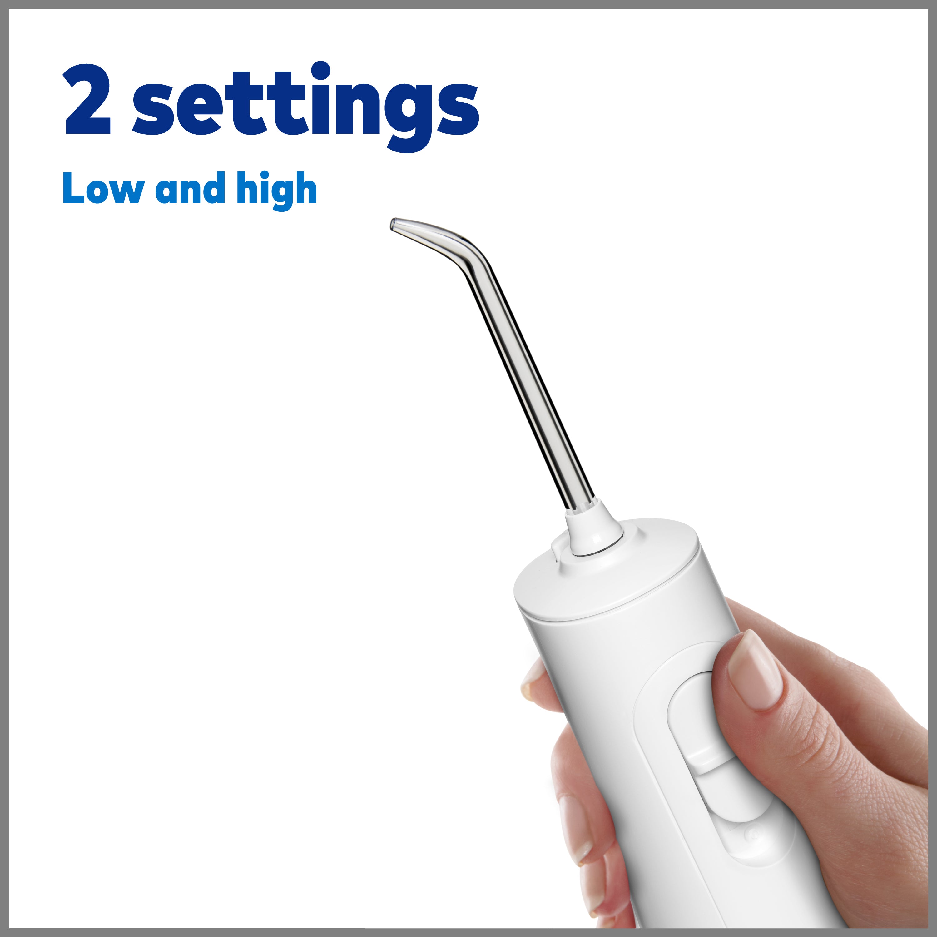 The Cordless Enhance water flosser comes with 2 flossing tips, 2 pressure settings, global voltage compatibility, and a removable water reservoir with up to 45 seconds of flossing time.